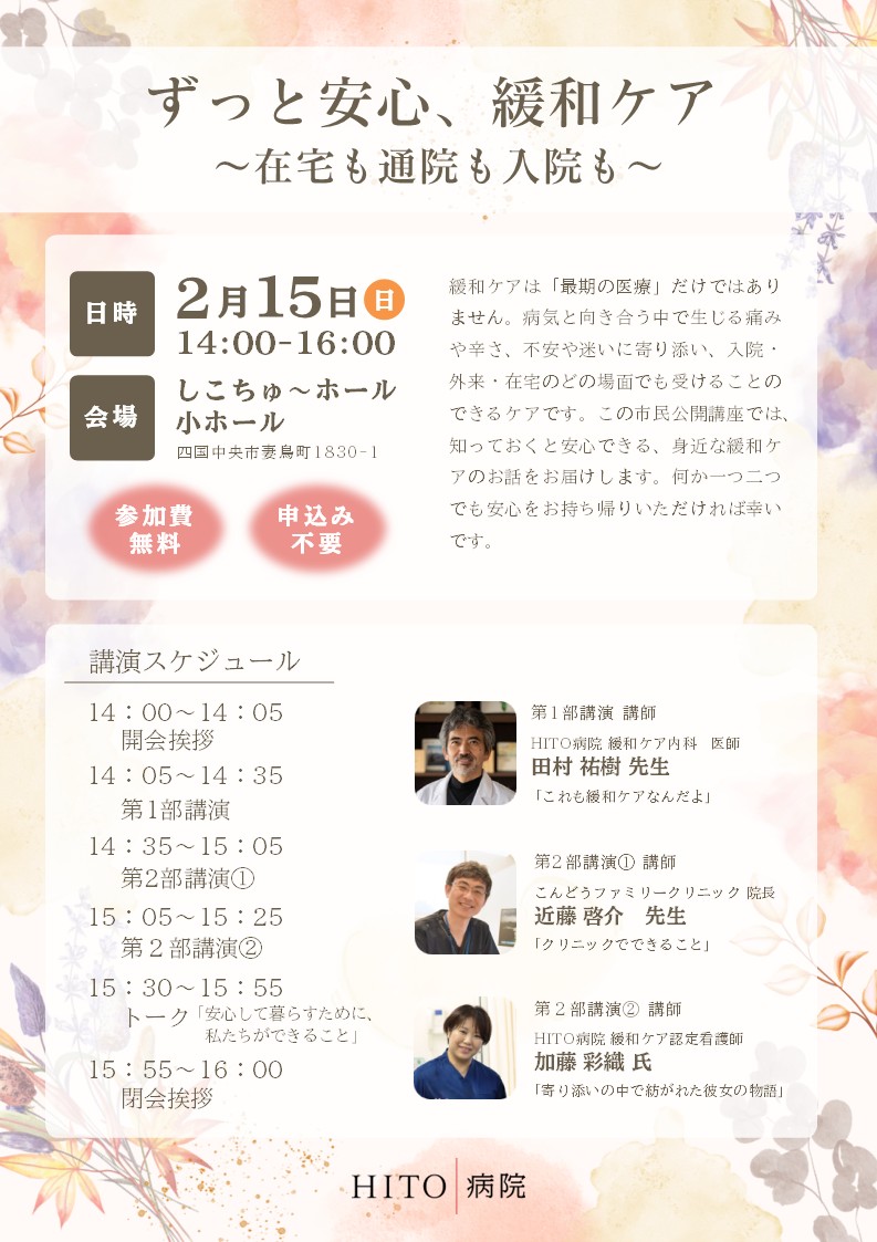 2026年2月15日(日)14:00~16:00、しこちゅ~ホール 小ホールにて、市民公開講座「ずっと安心、緩和ケア ~在宅も通院も入院も~」を開催いたします。 本講座では、こんどうファミリークリニ…